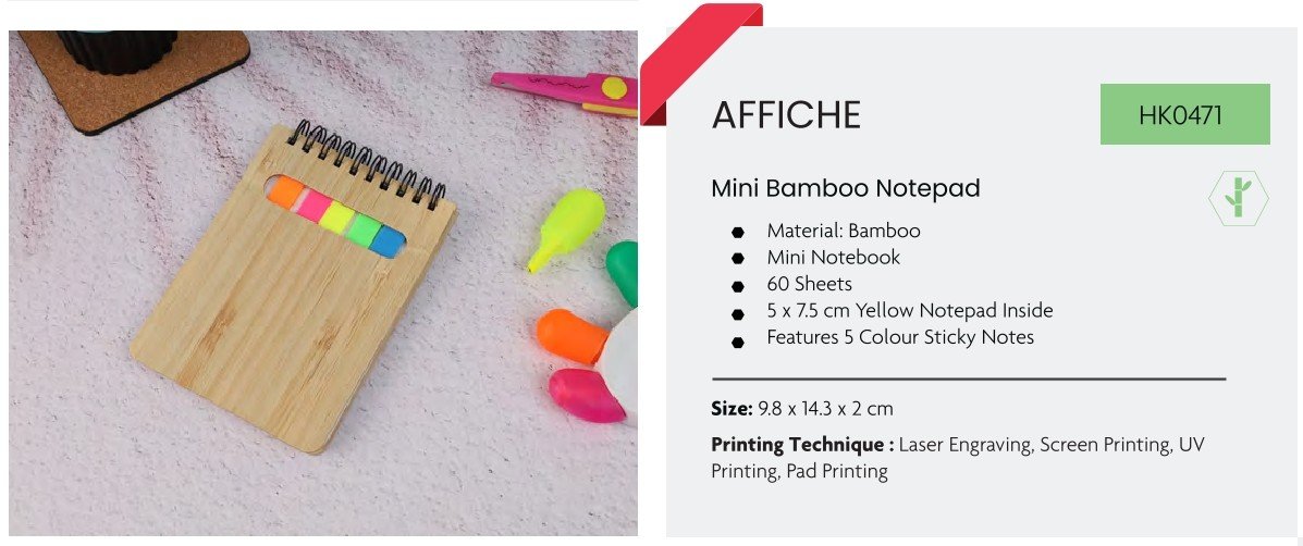 Compact eco-friendly bamboo notepad with sticky notes and 60 sheets—perfect for office use and promotional giveaways.