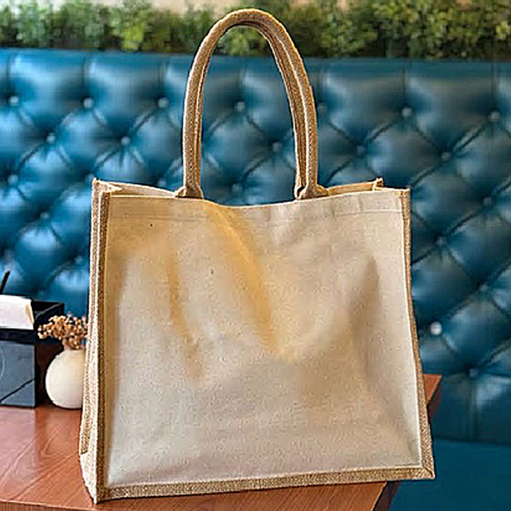 Durable and eco-friendly jute canvas bag with velcro closure and cotton webbed handles, ideal for promotional events and corporate branding.