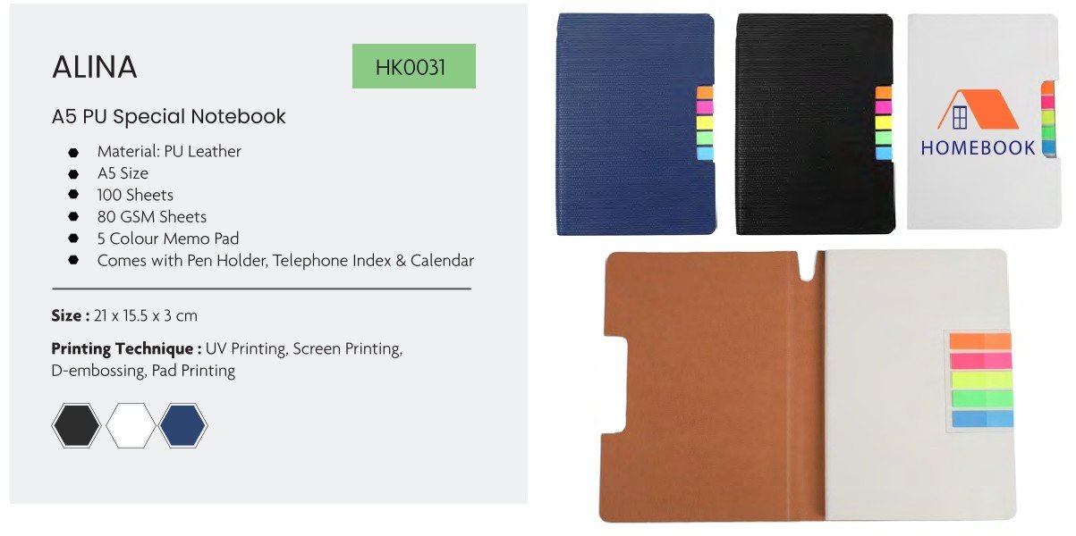 Premium A5 PU leather notebook with 100 sheets, memo pads, and built-in organizer features—ideal for professional and corporate use.