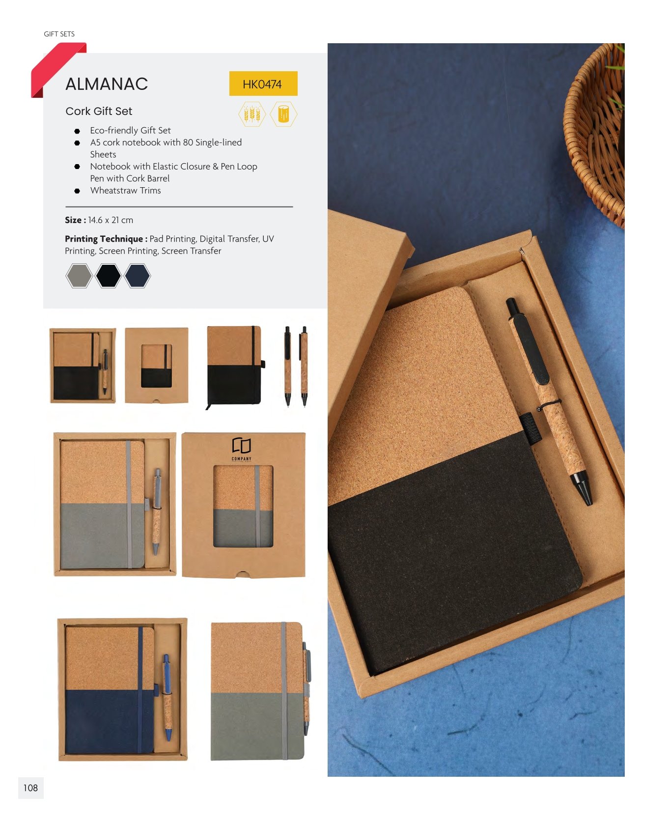 Eco-friendly cork gift set including A5 notebook and cork-barrel pen, fully customizable with multiple printing options.