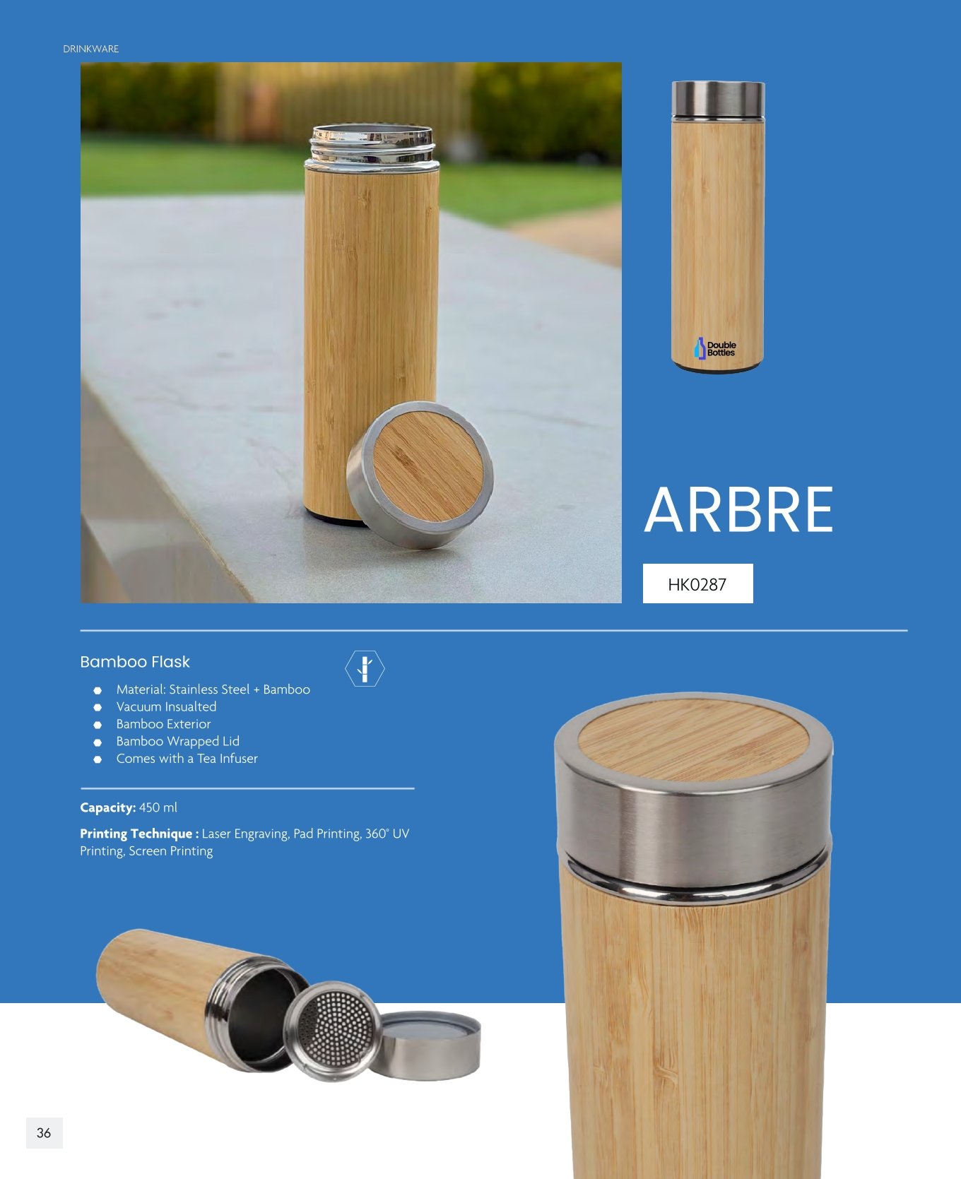 Stylish 450 ml stainless steel flask with bamboo exterior, vacuum insulation, and included tea infuser, ideal for daily use and corporate gifting.
