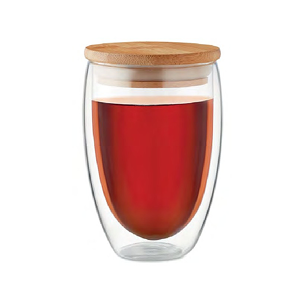 350 ml double-walled borosilicate glass tumbler with bamboo lid and silicone ring, leak-proof and perfect for hot or cold beverages.