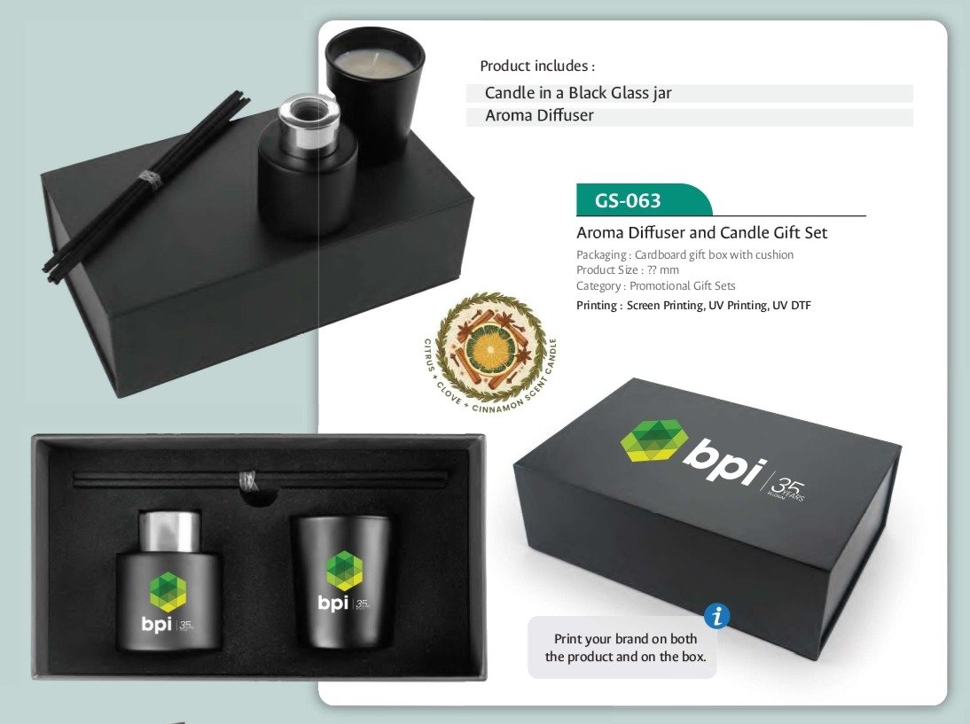 Luxury promotional gift set with black glass candle and aroma diffuser, presented in a cardboard box with cushion, customizable on product and packaging.