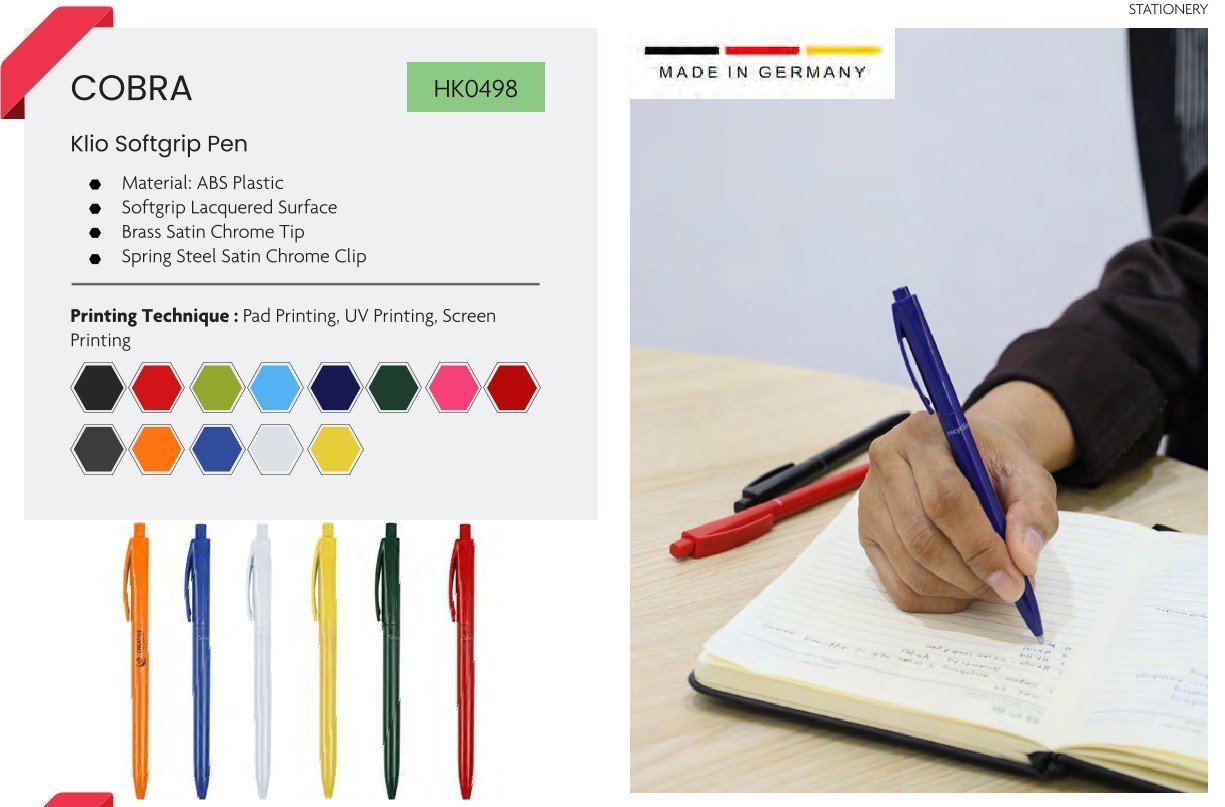 German-made ABS pen with softgrip lacquered surface, brass satin chrome tip, and satin chrome clip—perfect for professional use and branding.