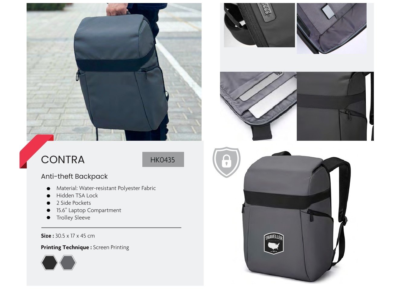 Secure and stylish anti-theft backpack with TSA lock, laptop compartment, and trolley sleeve, ideal for travel and corporate giveaways.