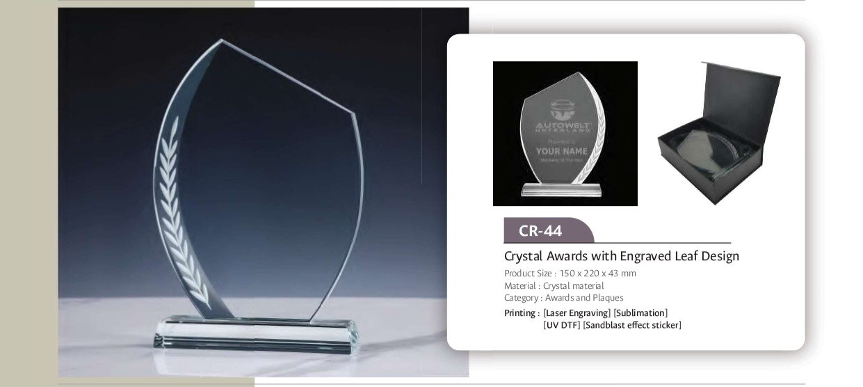 Elegant crystal award featuring an engraved leaf motif, perfect for corporate recognition, educational achievements, and special occasions.