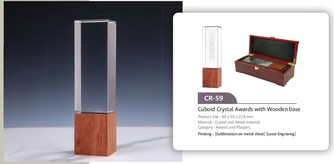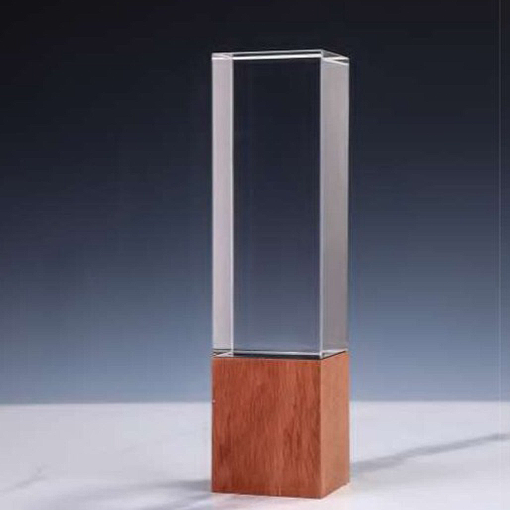 Stylish cuboid-shaped crystal award with a wooden base, ideal for corporate recognition and commemorative events.