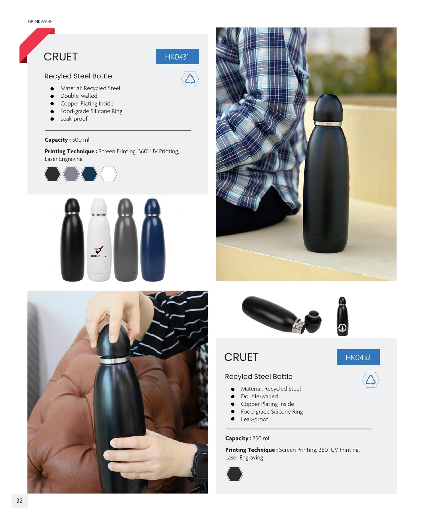 Eco-friendly 500 ml double-walled recycled steel bottle with copper-plated interior, leak-proof design, and customizable printing.