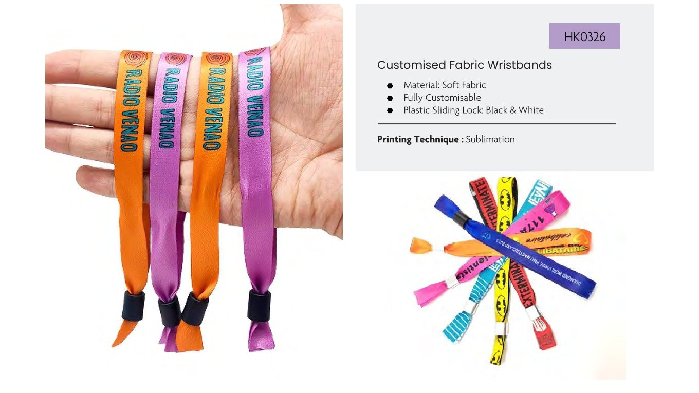Soft fabric wristbands with fully customisable design and secure plastic sliding lock.