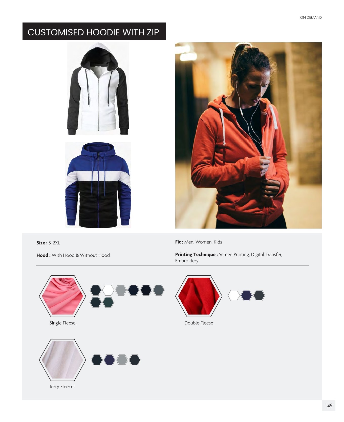 These hoodies with zip are perfect for casual wear, branding, or team apparel. Available in sizes S to 2XL and suitable for men, women, and kids. Options include hooded or non-hooded designs, and multiple fleece materials—Single Fleece, Double Fleece, or Terry Fleece—for comfort and warmth. Customizable via screen printing, digital transfer, or embroidery.