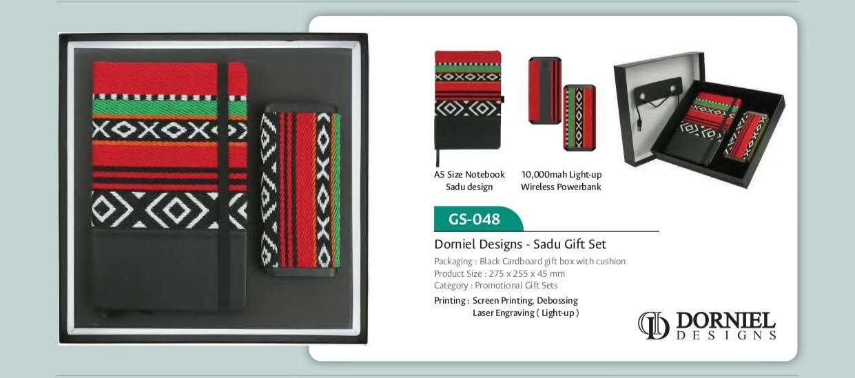 A5 Sadu-pattern notebook paired with 10,000 mAh light-up wireless power bank, presented in a black cardboard gift box with cushion, fully customizable.
