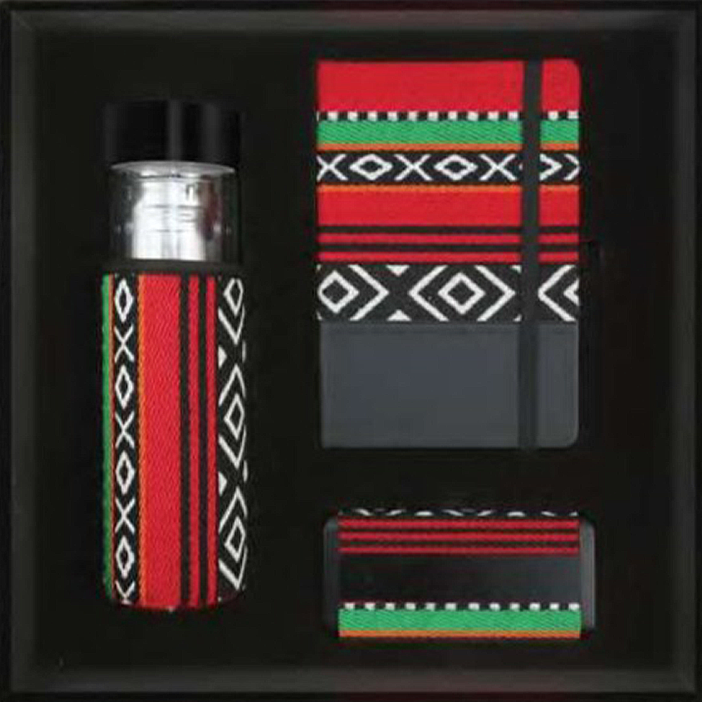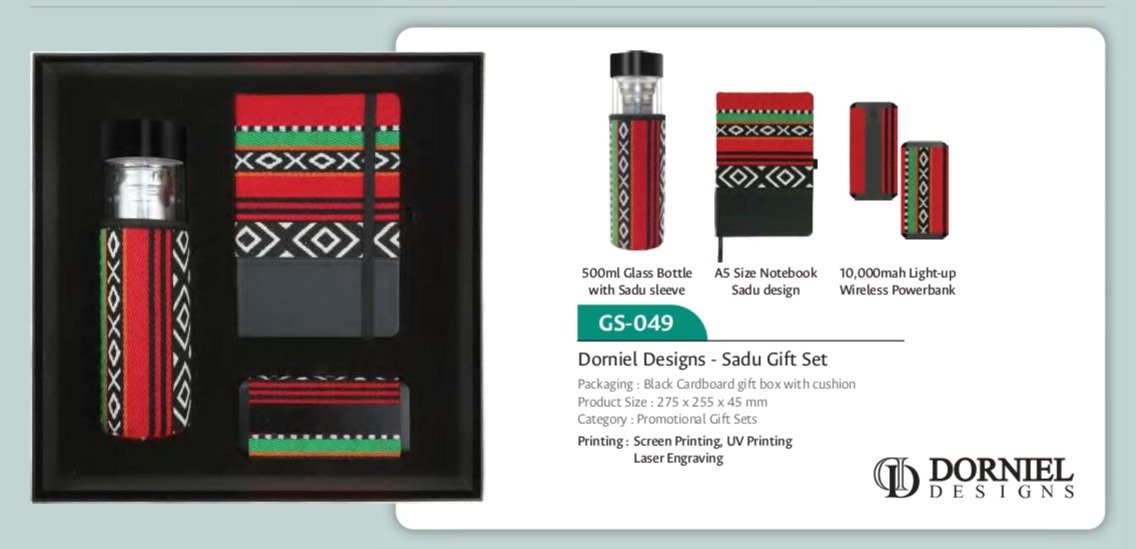 - Components: 500 ml Glass Bottle with Sadu Sleeve, A5 Notebook (Sadu Design), 10,000 mAh Light-up Wireless Power Bank, Black Cardboard Gift Box with Cushion