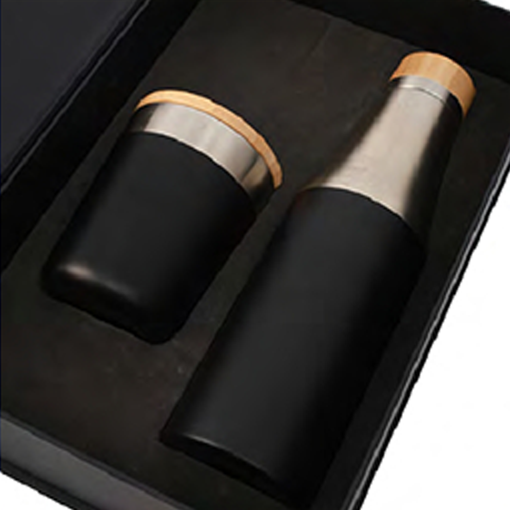Luxury gift set with double-walled stainless steel bottle and tumbler, presented in a magnetic box with velvet foam.