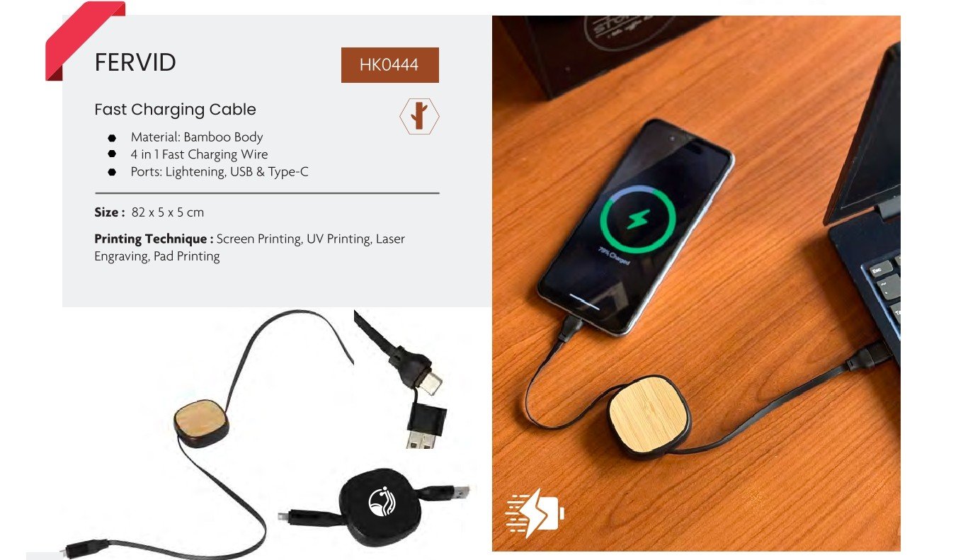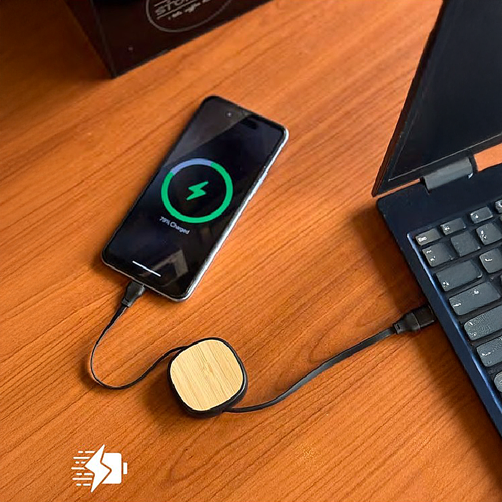Premium bamboo charging cable with 4-in-1 ports supporting Lightning, USB, and Type-C devices.