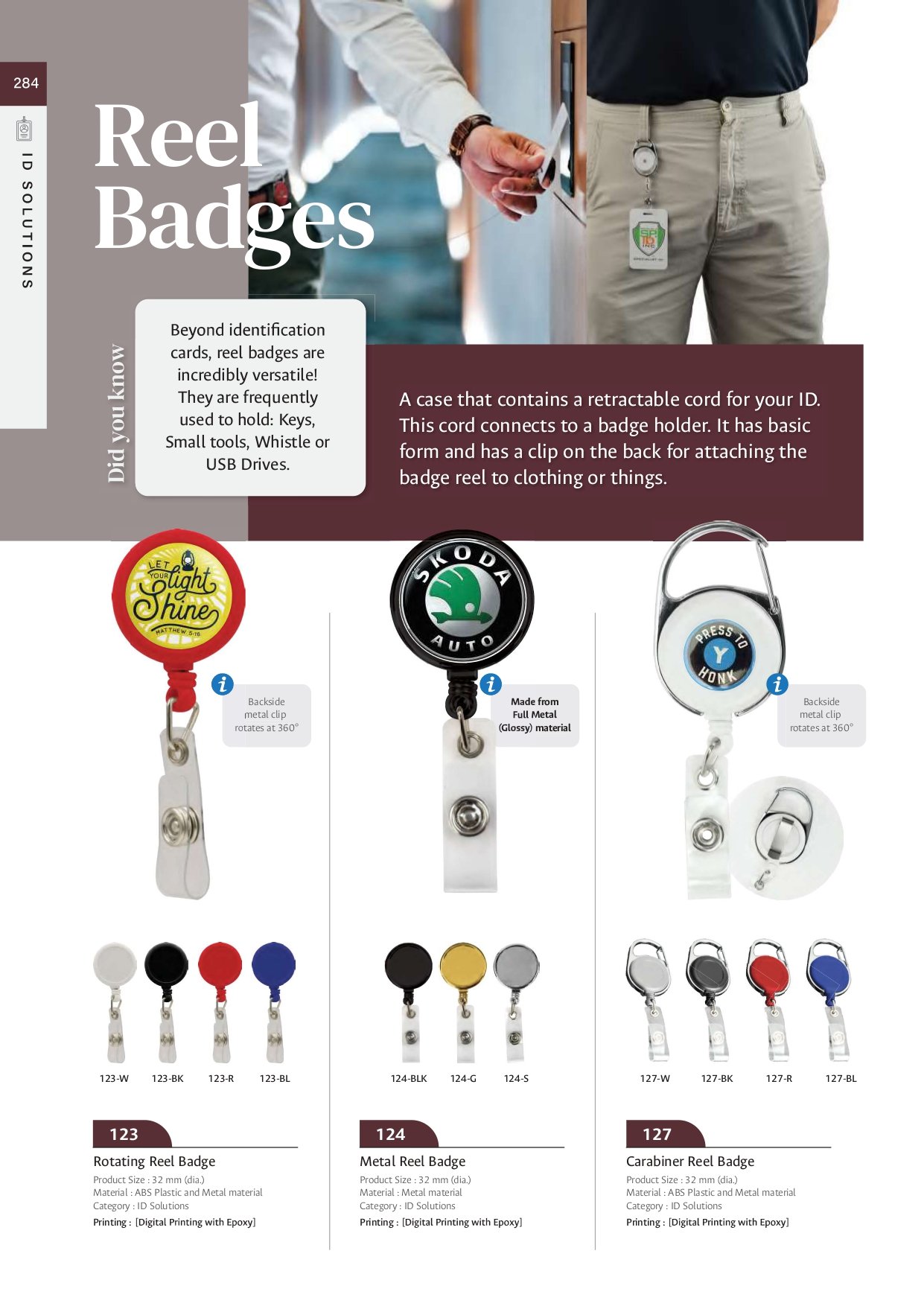 Versatile retractable reel badges for ID cards, keys, small tools, USB drives, and more. Available in ABS plastic, metal, and carabiner variants, with full-color digital printing.