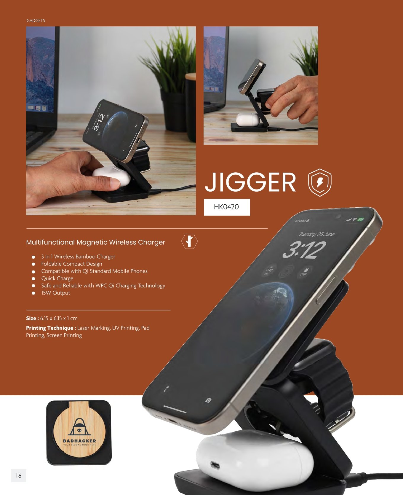 3-in-1 foldable bamboo wireless charger with 15W output, compact design, and Qi-compatible fast charging.