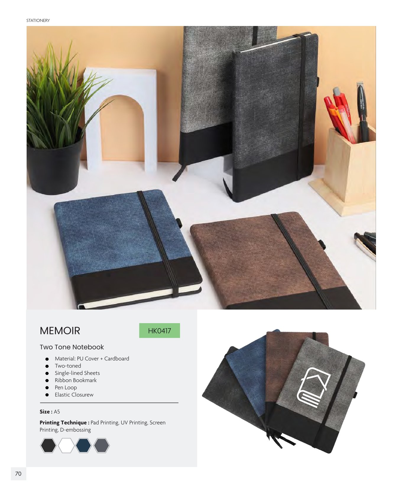 Stylish A5 two-tone notebook with single-lined sheets, ribbon bookmark, pen loop, and elastic closure—perfect for professional use and branding.