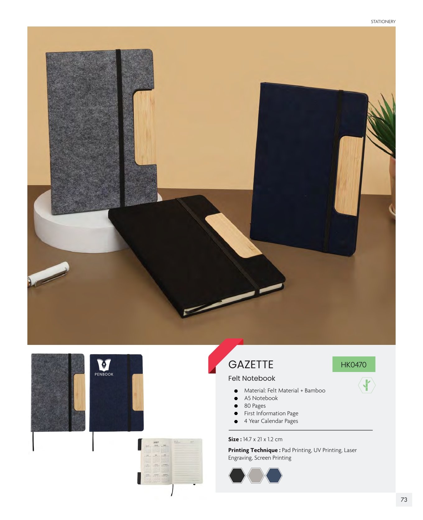 Eco-friendly felt notebook with 80 pages, first information page, and 4-year calendar—perfect for professional and promotional use.