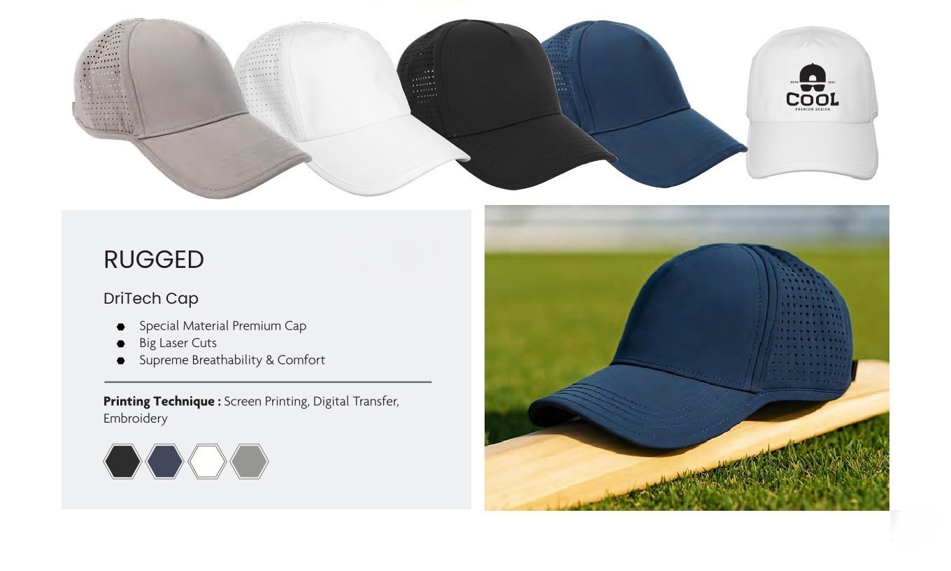 Premium DriTech cap with special performance material and large laser-cut vents for superior breathability and comfort.